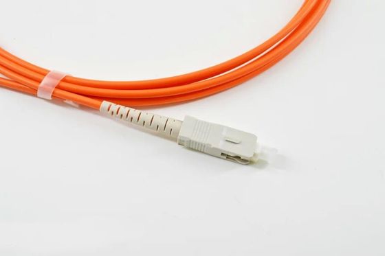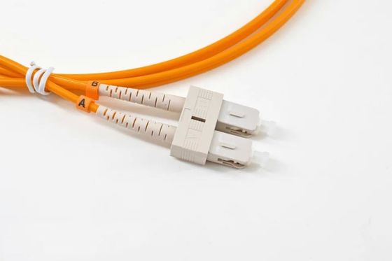 Serat multimode (Multi-mode Fiber): kabel patch serat berwarna oranye, konektor, dan beige perumahan; transmisi jarak pendek.